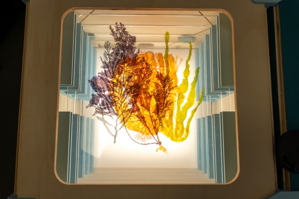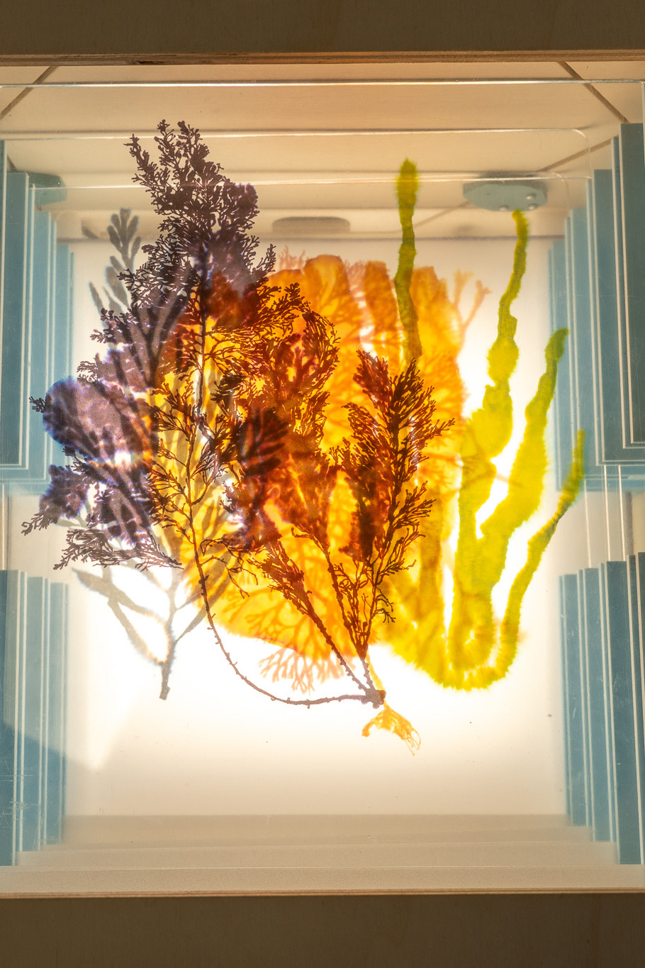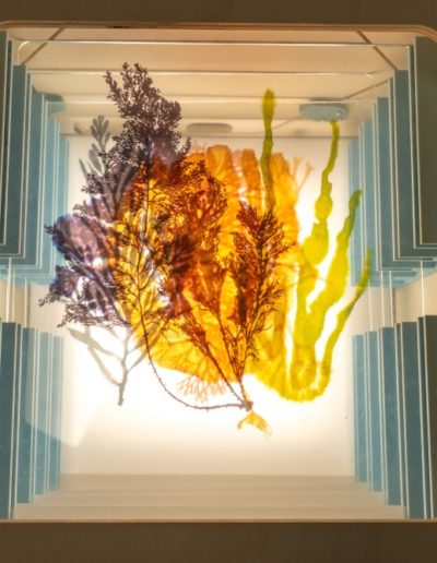 - 20 dessins réalisés au feutre avec une technique aquarelle, et reproduits par sérigraphie sur 20 plaques de plexiglass coulissantes. Le visiteur peut créer des bouquets d’algues, en faisant coulisser les plaques pour les superposer à l’infini.
