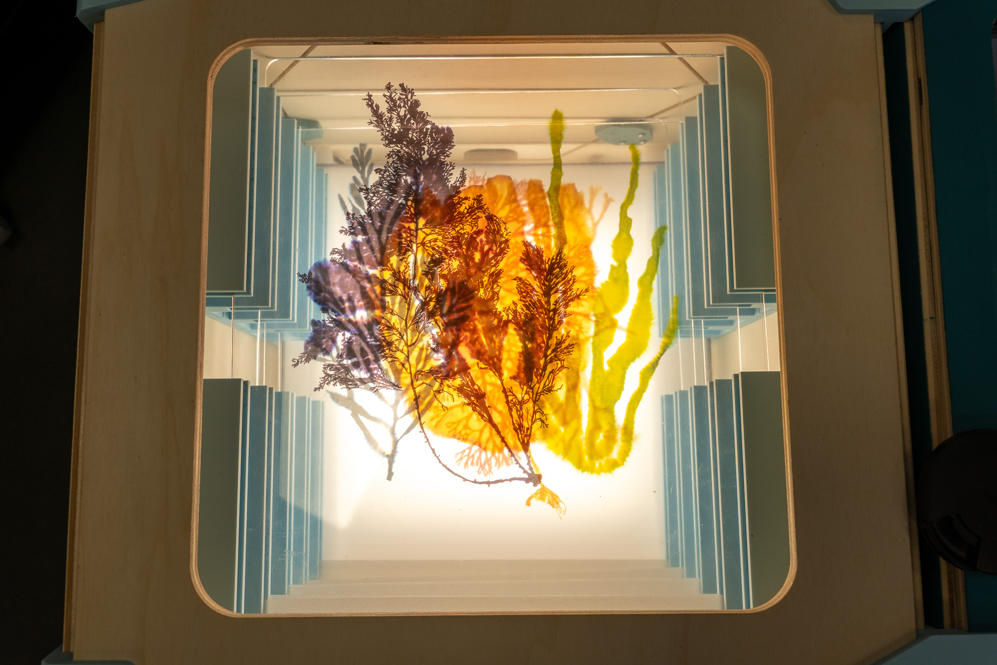 - Un enregistrement de la voix de l’artiste (à écouter au casque) qui lit les légendes de l’alguier des frères Crouan, informant de manière poétique les visiteurs sur l’environnement des algues.