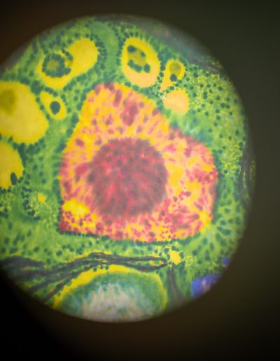 L’œuvre propose trois étapes pour découvrir l’algue à partir de dessins réalisés avec une technique aquarelle, d’un microscope où voir une cellule végétale d’algue et d’un enregistrement poétique sur l’environnement des algues.